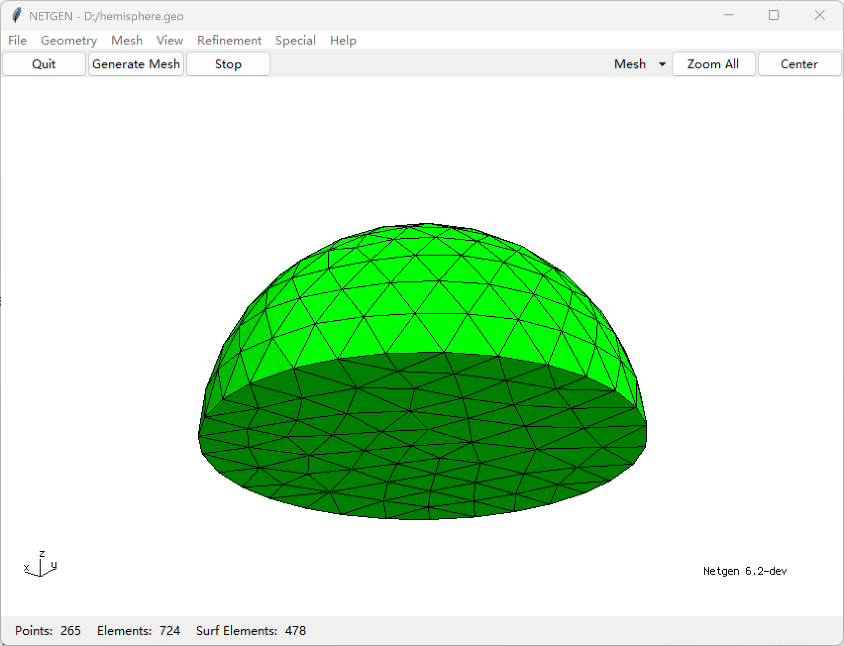 Gmsh supports OpenCASCADE geometry kernel, enabling direct creation of complex shapes. Below is a modified Julia example generating the same hemisphere and exporting to Gmsh format: