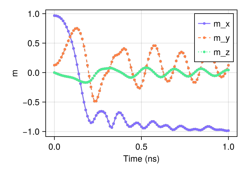 H_s=[(0, 0, 0), (-24.6mT, 4.3mT, 0)]);Run the simulation using the sim_with function: