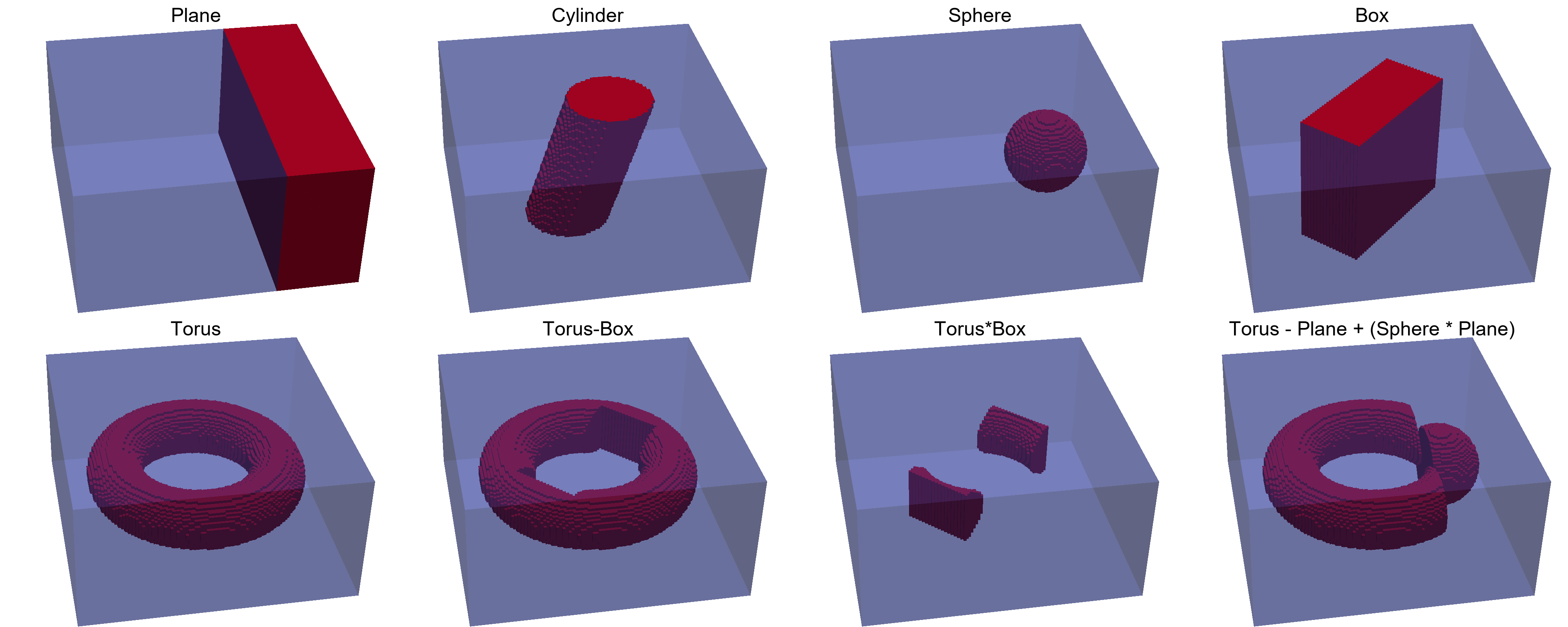 In addition to using functions to define shapes, for some regular shapes and their combinations, we can use basic shapes and boolean operations defined in MicroMagnetic to achieve this. MicroMagnetic supports Plane, Cylinder, Sphere, Box, and Torus, etc., as basic shapes.